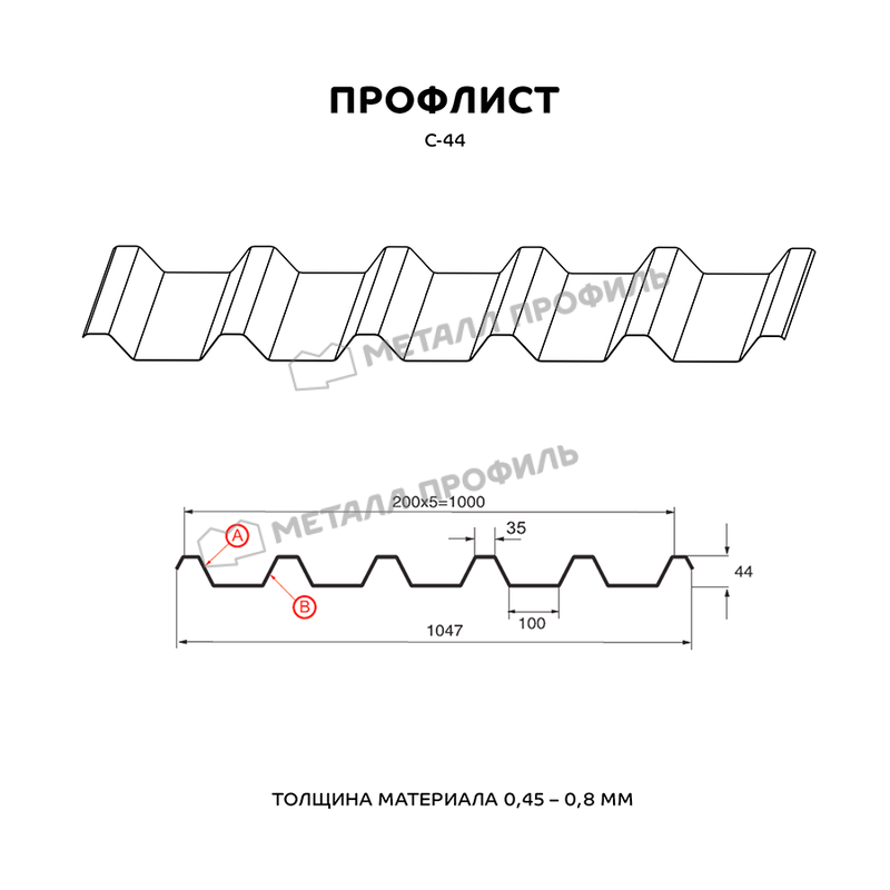 Профлист Металл Профиль C44 0.45 Полиэстер RAL 9010 Чистый белый A